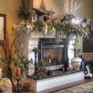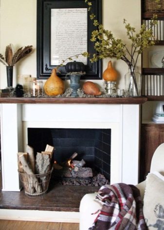 المواد الطبيعية جميلة بشكل خاص في ديكور الخريف. الاختيار في هذا الصدد ضخم: الأغصان المجففة والأوراق والتوت والفواكه والخضروات الناضجة والأقماع والمكسرات والسنيبلات. يمكن أن يكون تكوين جميع العناصر المدرجة بمثابة أساس لديكور الموقد. يمكنك صنع أكاليل زهور أو أكاليل أو باقات يمكن وضعها على الحائط وعلى رف الموقد..
