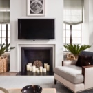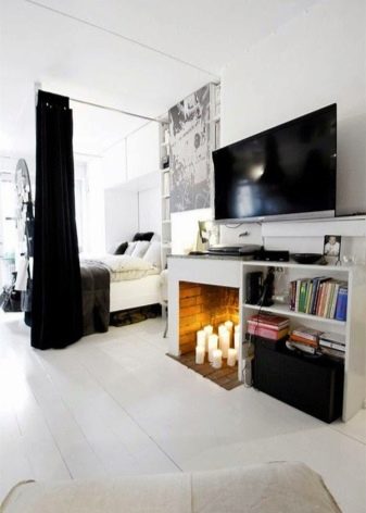 أسرع طريقة لإنشاء رف هي دريوال. لتوسيع المساحة ، تم قطع التجويف الموجود في الجدار بمادة عاكسة ، بالإضافة إلى عناصر الفسيفساء. حصى البحر ، الموضوعة حول الشموع الضخمة ، تضفي على الموقد طبيعية ، وكما كانت ، تجسد لم شمل العنصرين.