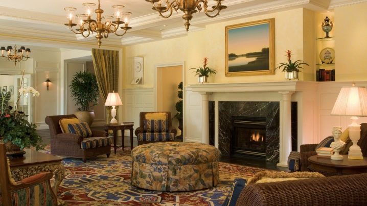يُلزمك التصميم الداخلي الكلاسيكي الذي يحتوي على مدفأة بشراء نموذج ضخم وثقيل ، مبطن ببذخ بالحجر أو أي مادة أخرى. الشكل 4