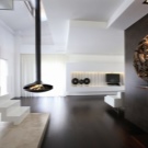 للمنازل الكبيرة تصميمات مختلفة تمامًا. تشغل أرفف المانتل البارزة من الجدار الجزء المركزي من الداخل وتكرر بشكل مثالي التصميم الأسلوبي للغرفة. تؤكد هذه المواقد تمامًا على عظمة الغرفة وتخفي المساحة الزائدة..