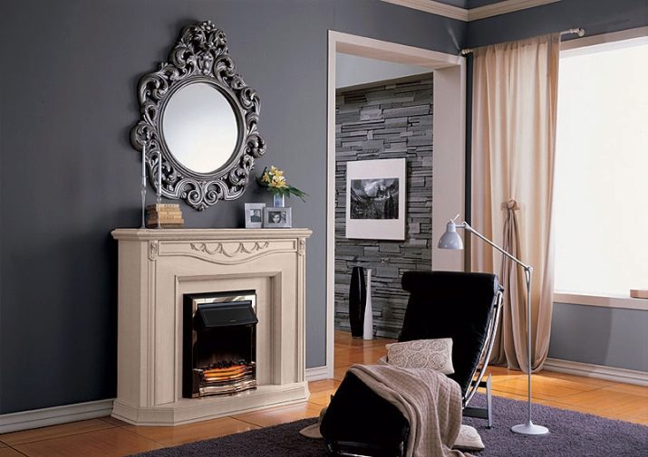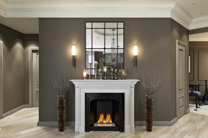 وأهم نصيحة للمصممين هي كما يلي: إذا كان الموقد مثبتًا على الحائط ، فمن الأفضل تعليق مرآة كبيرة عليه (أعلى قليلاً من هيكل الموقد). سوف يعكس مساحة الغرفة ، مما يجعلها أكثر اتساعًا وراحة..