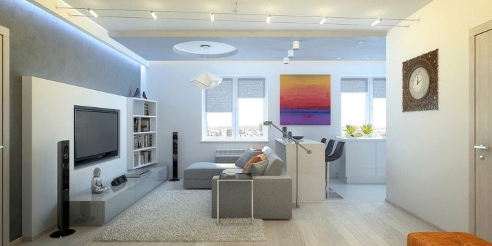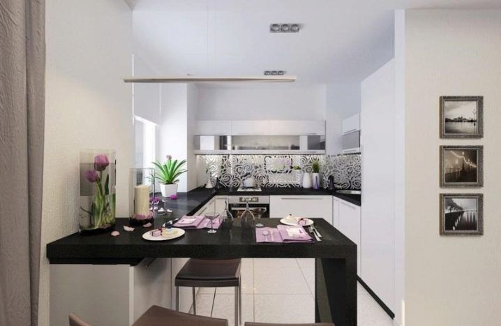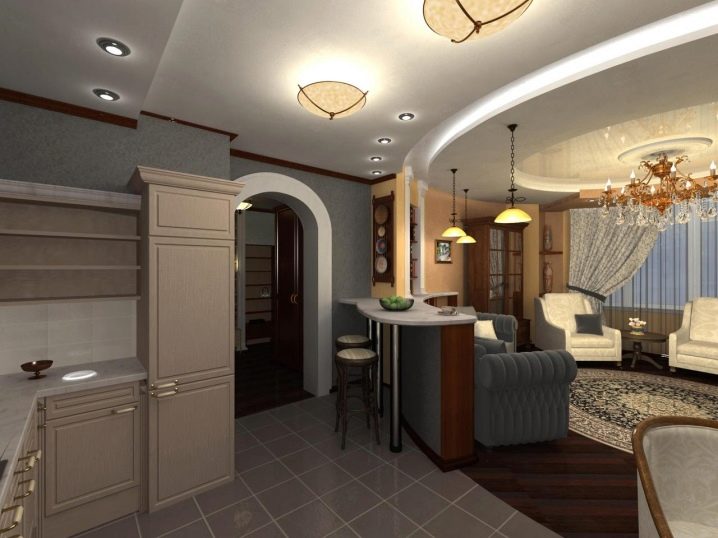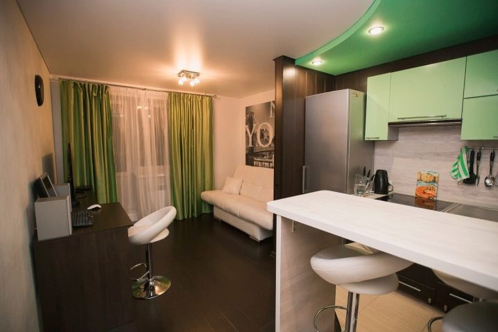 غالبًا ما تستخدم عدادات البار في تصميم غرفة المعيشة في المطبخ. إنها تمنح الغرفة مظهرًا عصريًا وتبدو مثيرة للاهتمام وغير عادية. إذا كانت العائلة صغيرة ، فيمكن أن يكون هذا الشيء مفيدًا وعمليًا..