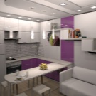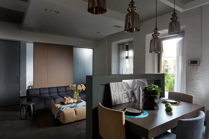 يمكن الاستيلاء على دور القسم بواسطة الأثاث ، على سبيل المثال ، أريكة. تعامل مع هذه القضية بشكل نقدي. لا يبدو قرب منطقة الطهي من الأثاث المنجد عمليًا جدًا. الغبار الزيتي ، حتى لو كان هناك غطاء فوق الموقد ، سوف يتراكم على قماش الأثاث. سيتطلب هذا رعاية خاصة.