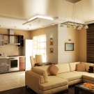 غرفة معيشة – مطبخ بمساحة 25 متر مربع. من الممكن تمامًا عزل المناطق بأرضية متدرجة. هنا يجدر مراعاة ارتفاع الأسقف. سترفع المنصة سطح الأرض إلى ارتفاع حوالي 20-40 سم. مع الأسقف المنخفضة ، سيكون هناك شعور بالضيق وعدم الراحة النفسية. يبدو أن فكرة الأرضية المزينة بمواد مختلفة الملمس واللون بسيطة جدا ومثيرة للاهتمام. على سبيل المثال ، استخدام صفح ومشمع في غرفة واحدة. إذا كنت تقوم بوضع البلاط ، فمن الآمن استخدام البلاط غير القابل للانزلاق. ستعطي هذه التقنية إحساسًا بفصل الغرفة بجدار غير مرئي..