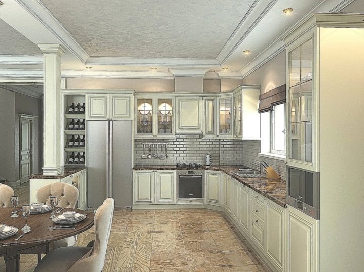 غرفة معيشة مطبخ على شكل حرف U. على الأرجح ، هذه غرفة مستطيلة الشكل ، حيث تم تغطية ثلاثة جدران من أصل أربعة بالأثاث. يمكن وضع مجموعة المطبخ على شكل حرف G. ثم يتم تخصيص جزء كبير من المساحة لغرفة المعيشة. هذا مناسب إذا كان هناك ضيوف في كثير من الأحيان في المنزل..