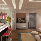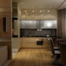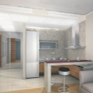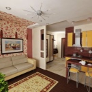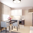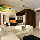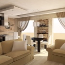 يمكنك إجراء تقسيم المناطق باستخدام مواد مختلفة للأرضية ، على سبيل المثال ، الباركيه في غرفة المعيشة ، والبلاط في المطبخ ، والتي يتم فصلها بشريط معدني رفيع. يمكنك أيضًا التمييز بين المنطقتين بمساعدة منضدة بار ، والتي ستحل محل طاولة الطعام..