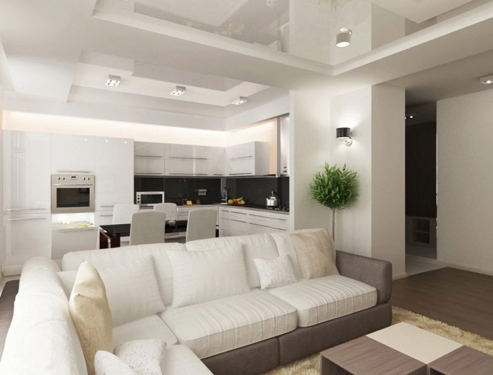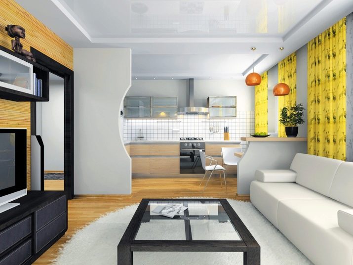 بعد اختيار الاتجاه الأسلوبي ، يجب عليك تقسيم الغرفة واختيار الخيار الذي سيتم إنتاجه به. في الحالات التي تكون فيها الغرفة على شكل حرف L أو قوس في المنتصف ، تختفي مشكلة تقسيم المناطق من تلقاء نفسها ، حيث تم حلها بالفعل. إذا كانت غرفة المعيشة في المطبخ ذات شكل مستطيل عادي ، فعليك أن تقرر كيفية فصل منطقة عن أخرى.