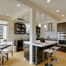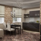 خيار شائع آخر لتقسيم غرفة المعيشة في المطبخ هو استخدام خيارات التشطيب. بمساعدتهم ، يمكنك إنشاء حدود منطقتين بصريًا. على سبيل المثال ، جدران المطبخ مزينة بالجص ، والجدران في غرفة المعيشة مزينة بورق الجدران. لا تزال الطريقة الأكثر شيوعًا في هذه الحالة هي تقسيم المناطق بين الجنسين. في غرفة المعيشة ، الأرضية مغطاة بالباركيه أو المصفح ، وفي المطبخ بالبلاط.