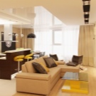 يحدث تقسيم المناطق في بعض الأحيان وفقًا للأثاث. على سبيل المثال ، يتم وضع أريكة كبيرة وناعمة مع ظهر المطبخ ، مما يؤدي إلى فصل غرفتين. في بعض الأحيان ، لفصل المطبخ عن غرفة المعيشة ، يتم استخدام الخزائن أو الخزانات أو أثاث المطبخ نفسه ، حيث توجد منطقة عمل للمضيفة في الأعلى. في كثير من الأحيان ، للتمييز بين غرفتين ، أستخدم رفوفًا عالية ، لا تحمل الوظائف فحسب ، بل تتميز أيضًا بالتطبيق العملي ، ولها أيضًا خصائص جمالية. لذلك ، من جانب منطقة المعيشة ، يمكن أن يكون الرف بمثابة حامل للتماثيل الجميلة والإطارات مع الصور العائلية والكتب وغير ذلك الكثير ، اعتمادًا على الرغبات وتفضيلات الذوق للمالكين أنفسهم..