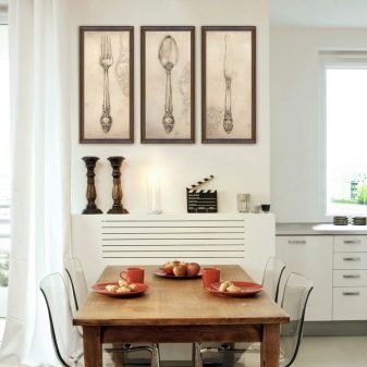 - تلوين. المناظر الطبيعية الفاتنة أو الحياة الساكنة الفاتنة هي الحل الأمثل للمطبخ. من الأفضل تعليق هذه الصورة على طاولة الطعام. الشيء الرئيسي هو اختيار الحجم والكمية الصحيحين. صورة واحدة أو صورتان جيدة ، لكن ثلاث صور أكثر من اللازم بالفعل.