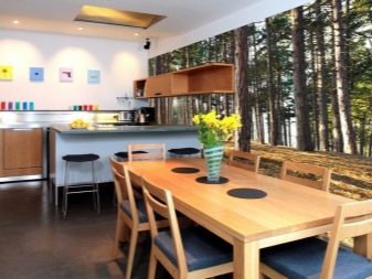 - خلفية رفيق. بمساعدتهم ، يمكنك تزيين المطبخ بأكمله بلون واحد محدد. في نفس الوقت ، يمكن صنع لهجة مشرقة في منطقة تناول الطعام. ورق الحائط المصاحب عبارة عن مجموعة من عدة لفات ، متطابقة في الملمس والخلفية الأساسية ، ولكنها مختلفة في النمط.