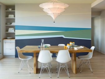 ثاني أكثر الطرق تعقيدًا ماليًا وماديًا لتحويل وتزيين منطقة تناول الطعام. عادةً ما يظل الجدار الذي توجد عليه طاولة الطعام هو الحائط الفارغ ، لذلك يمكن وينبغي تسليط الضوء عليه بشكل خاص. هناك عدة طرق للقيام بذلك: