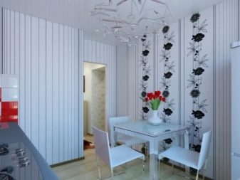 - خلفية رفيق. بمساعدتهم ، يمكنك تزيين المطبخ بأكمله بلون واحد محدد. في نفس الوقت ، يمكن صنع لهجة مشرقة في منطقة تناول الطعام. ورق الحائط المصاحب عبارة عن مجموعة من عدة لفات ، متطابقة في الملمس والخلفية الأساسية ، ولكنها مختلفة في النمط.