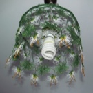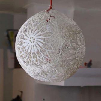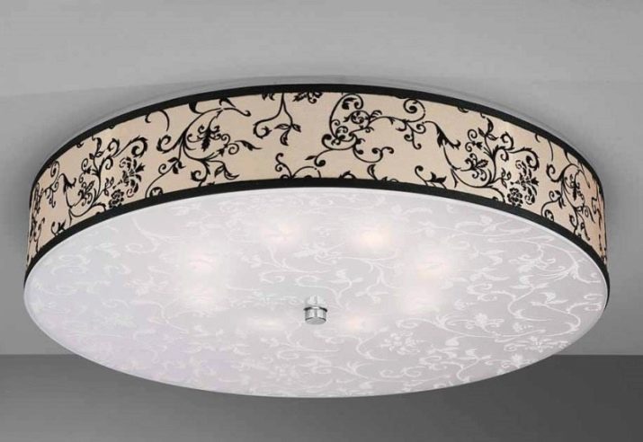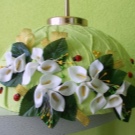 هناك خيار آخر لإنشاء عاكس الضوء من القماش للمطبخ وهو استخدام إطارات أطواق جاهزة. من السهل جدًا تغطية مثل هذا الهيكل بقطعة قماش. كما تستخدم الزهور الاصطناعية والدانتيل والجديلة للزينة..