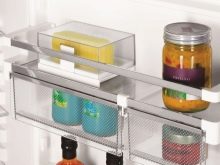 يوجد على الباب الجانبي أرفف وصواني للصلصات والمربى والبيض والمشروبات.