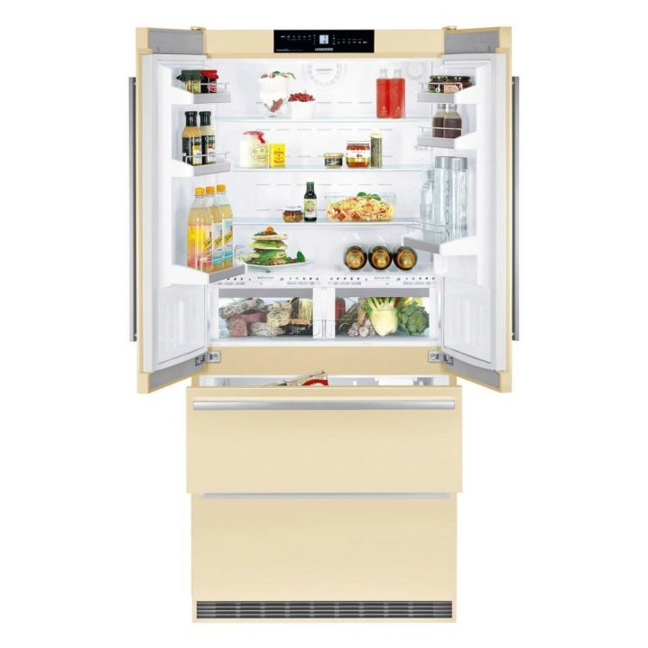 غالبًا ما يتم اختيار الأجهزة باللون البيج متعدد الاستخدامات ، لأنها تخلق وتحافظ على جو مريح وحيوي في الغرفة. قدمت الشركة النموذج Liebherr CBNBE 6256 لون رملي مع باب أرجوحة فرنسي, والتي تتناسب بشكل متناغم مع العديد من الأساليب في مساحة المطبخ. على الرغم من اللون الفاتح ، فإن سطح الثلاجة سهل التنظيف..