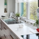 هذا الترتيب للحوض يمكن أن يوفر الكهرباء بشكل كبير. في أغلب الأحيان ، يتم تثبيت الأحواض في زاوية مظلمة أو مقابل النافذة. في هذه الحالة ، تحتاج منطقة العمل إلى إضاءة إضافية. لكن تثبيت حوض أسفل النافذة سيحل هذه المشكلة. في النهار ، ليس عليك استخدام الإضاءة الكهربائية.