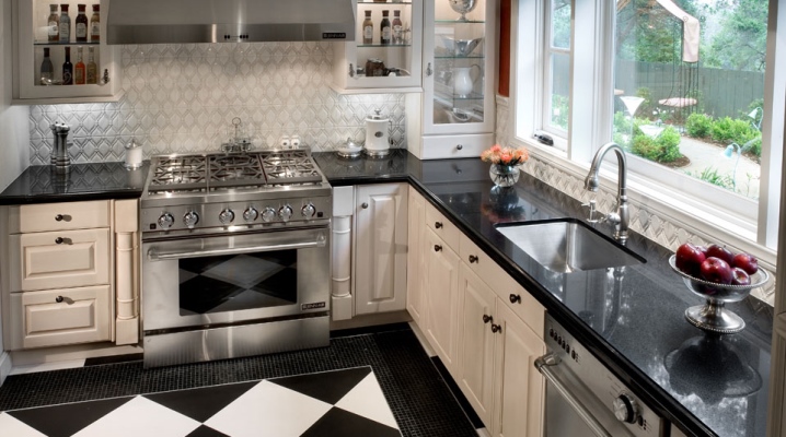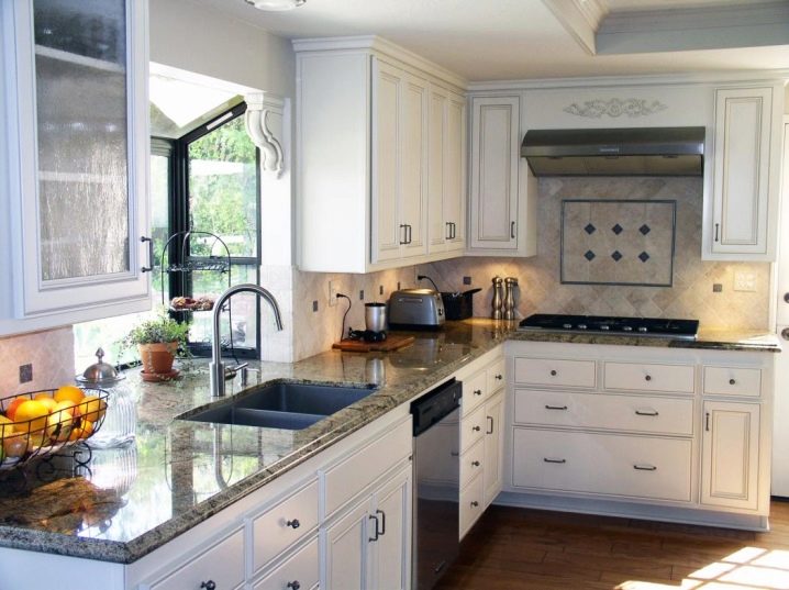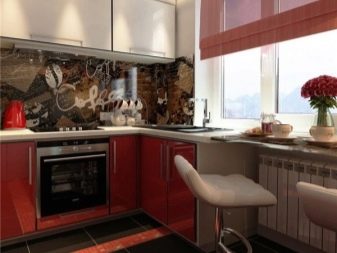 خيار آخر مثير للاهتمام هو موقع الحوض أسفل النافذة في مطبخ بحجم أو شكل غير قياسي. في هذه الحالة ، ستوفر مساحة كبيرة. ميزة أخرى مضافة هي أن هذا التصميم سيسمح لك بإخفاء البطارية. سيتم استكمال المساحة الخالية بأريكة زاوية مريحة مع طاولة صغيرة حيث يمكنك تناول العشاء مع عائلتك أو أصدقائك. الخيار الأكثر عملية هو تثبيت خزانة زاوية لتخزين جميع الأواني التي تحتاجها..
