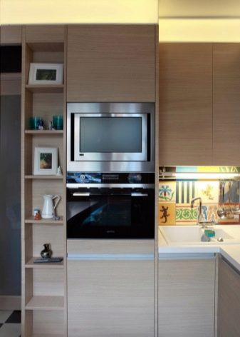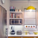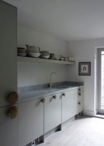 يجب أن تكون الأرفف أيضًا أسفل سطح العمل الرئيسي (سطح العمل). يوصي الخبراء بتثبيتها على ارتفاعات مختلفة بحيث يكون لديك مقصورات عالية ومنخفضة. بعد ذلك سيكون من المناسب وضع المقالي والأواني عليها..