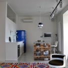 مزيج سماعة الرأس البيضاء والجدران مع لمعان معدني للأواني والأجهزة تبدو باردة قليلاً و “معقمة”. لذلك ، قام المصممون بتخفيف هذا الجزء الداخلي بطاولة خشبية غير مستوية ومصباح مطابق. تميل الزخارف على الجدران إلى أن تكون على الطراز الريفي. هنا ، يكتمل اللون الأبيض “المستشفى” حرفياً بالخضرة على الرفوف وخزانة كتب أنيقة للغاية. يجدر الانتباه – المطبخ صغير جدًا ، لكن عدم وجود خزائن الحائط والألوان الفاتحة للأثاث تجعله أكثر اتساعًا بصريًا..