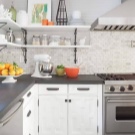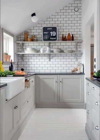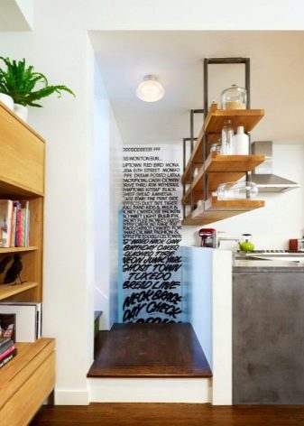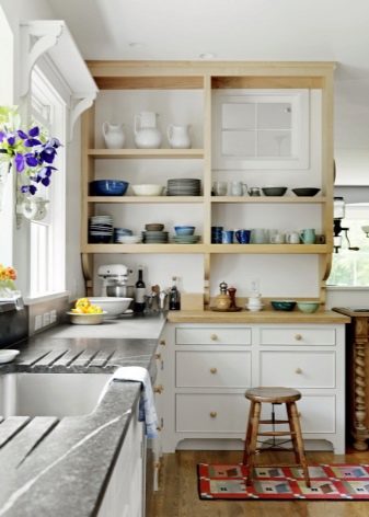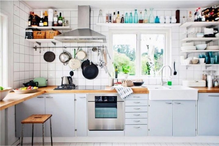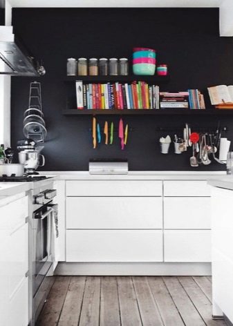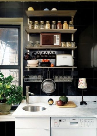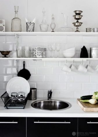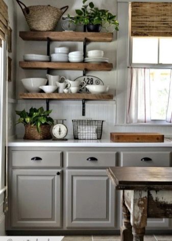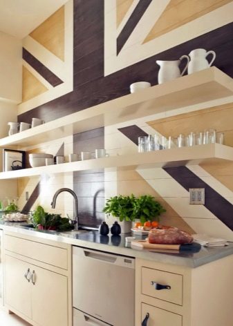 بالنسبة للمطابخ التي لا يمكن أن يكون الجدار فيها مزخرفًا تمامًا ، ومع ذلك تحتاج إلى استخدام المنطقة بطريقة ما ، يمكنك تقديم الخيار مع الأرفف. كحد أدنى – رف واحد أو رفان أو عدة أرفف على طول الطريق حتى السقف – في أنماط مختلفة ، يبدو كلا التصميمين جيدًا. على هذه الرفوف ، يمكنك وضع الأطباق والجرار مع التوابل. ينصح الخبراء بوضع شيء يتم استخدامه باستمرار: ثم لا يتشكل الغبار على الأطباق والأكواب ، ولن يكون للأرفف نفسها وقت لتتسخ..