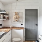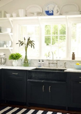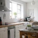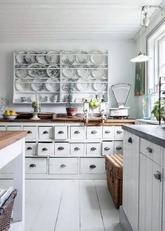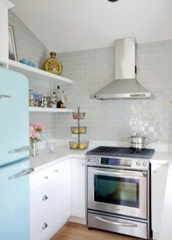 مثال على ذلك عندما لا يبدو المطبخ ذو الطبقة الواحدة فارغًا على الإطلاق. علاوة على ذلك ، سيكون أكثر من ذلك بقليل مع وجود أشياء على الجدران مبالغة. يقع الحوض بجانب النافذة: الغرفة مشرقة جدًا. يوازن عبء العمل على الجدران بتفاصيل صغيرة البساطة الشديدة للأثاث – مجموعة زرقاء فاتحة غير واضحة ، سطح طاولة خشبي ، شاشة مصنوعة من البلاط الأبيض المتواضع. يبدو الرف الموجود أعلى النافذة جيدًا جدًا: من المرجح أن تكون الزجاجات الموجودة عليه مزخرفة ، لكنها تخلق مزاجًا خاصًا جدًا في هذا الجزء الداخلي..