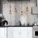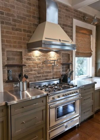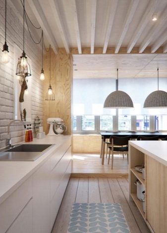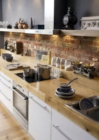 بالنسبة للمطابخ العلوية ، غالبًا ما تستخدم الغرف ذات التصميم الحضري أو البناء بالطوب أو تقليدها. في هذه الحالة ، يتم وضع هذا “المريلة” تحت السقف. لمنع جدار القرميد من أن يبدو فارغًا ، يمكنك تعليق المصابيح على أسلاك طويلة فوق سطح العمل ، مما يؤدي إلى إنشاء “نمط” إضافي.