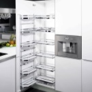 بالنسبة للمطبخ الذي لا يحتوي على خزانات علوية ، تعتبر الأدراج متعددة المستويات مثالية ، عندما يتم إخفاء 3-4 أرفف خلف واجهة واحدة. عندما تفتح المقدمة ، تسحب معك أعلى رف سفلي. الباقي يفتح حسب الرغبة ، أو (إذا تم استخدام نظام “المقود”) ، فإنهم “يزحفون” خلف الدرج السفلي.