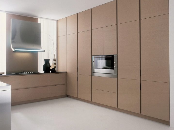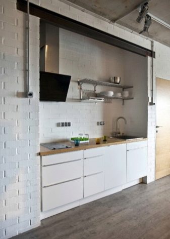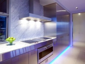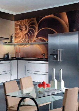 إذا لم يكن المطبخ كبيرًا جدًا (على سبيل المثال ، تبلغ مساحته 9 أمتار مربعة) ، ولم يكن صف الأثاث طويلًا جدًا ، فيمكنك المرور بجدار “مكشوف”. غطاء معدني على جدار ضوئي مسطح تمامًا ومجهز جيدًا يتناسب تمامًا مع أسلوب التكنولوجيا الفائقة وغيرها من الاتجاهات “البسيطة”.