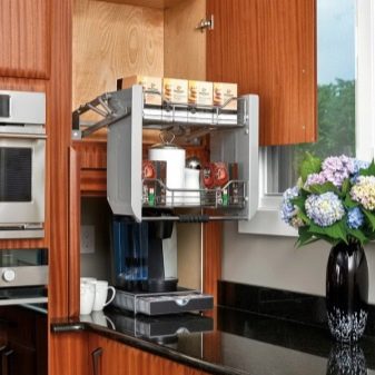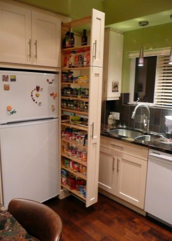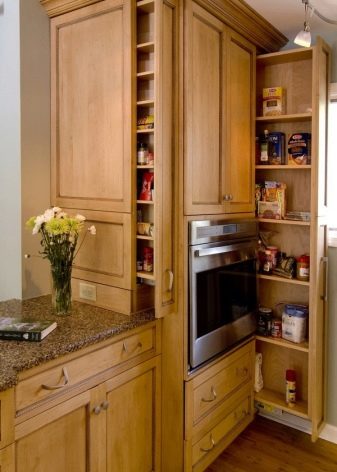 في خزائن الزاوية ، يمكنك وضع أرفف قابلة للسحب أو دائرية. تأكد من إلقاء نظرة فاحصة على حوامل الزجاجات – الخزانات الضيقة التي يتم سحب خلفها سلة شبكية معدنية للزجاجات مع الخل والصلصات والتوابل.