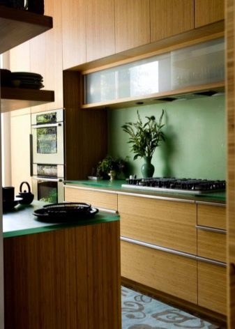 في المطبخ الأكبر ، يمكن أن يخلق الجدار العاري إحساسًا بالفراغ. لذلك ، من المقبول تمامًا صنع مئزر طويل ومشرق (معياري) من البلاط أو الزجاج الجميل. بعد المريلة – جزء من الجدار والسقف الأملس.