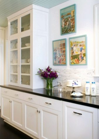 تسمح المجموعة أحادية الطبقة باستخدام 1-2 خزانات حائط صغيرة. ستبدو خزانات “النقطة” ذات الأبواب الزجاجية أو الشبكية جيدة جدًا. لكن – قاعدة مهمة – يجب أن يكونوا موجودين خارج منطقة العمل. غالبًا ما يتم تعليقهم حول الحواف أو الزوايا..