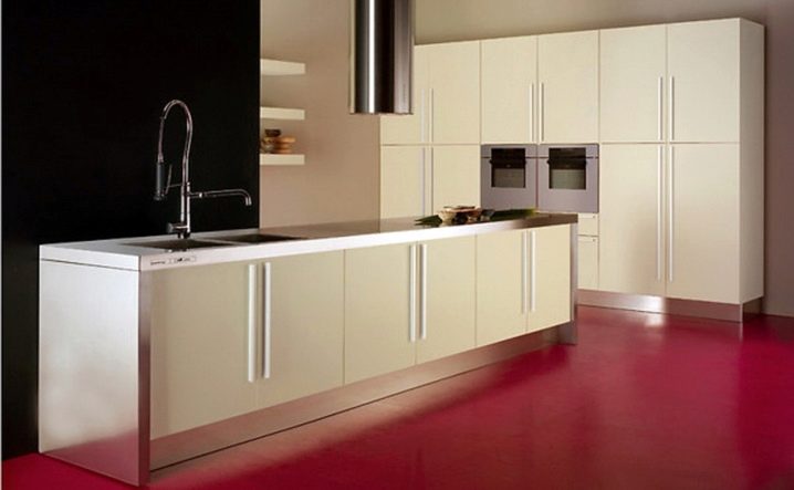 يجب أن تكون الطاولة طويلة بما يكفي. في ذلك ، مع مثل هذا التصميم ، يمكنك وضع الموقد في أحد طرفيه ، ثم طاولة عمل وفي الطرف الآخر مغسلة. غالبًا ما يمكن رؤية مثل هذه الحلول في برامج الطهي التلفزيونية (يتم غسل كل شيء وتقطيعه وإرساله إلى الموقد في مكان واحد تقريبًا) أو في المطابخ المفتوحة في المطاعم.