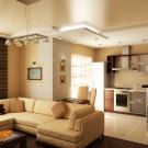 - تركيبات إضاءة. طريقة باهظة الثمن ولكنها أصلية لإضاءة غرفة المعيشة أو المطبخ. ستساعد العديد من الأضواء في إلقاء الضوء على جميع أركان الغرفة. وتبدو مثيرة للاهتمام وغير عادية. إذا كانت الشقة تحتوي على سقوف كبيرة وعالية ، فإن المصابيح المدمجة في السقف المعلق هي الحل الأفضل..
