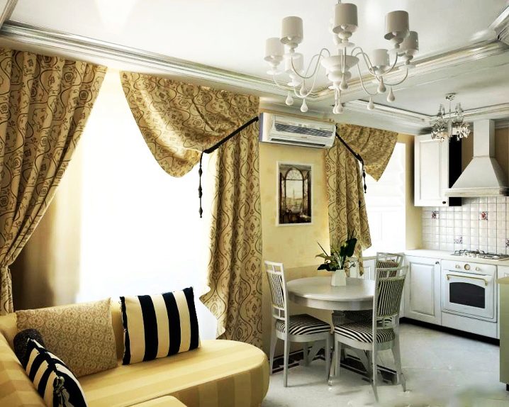 - كلاسيك. إنشاء تصميم مطبخ – غرفة معيشة بأسلوب كلاسيكي ، يستخدمون أشكالًا رشيقة وألوان الباستيل الناعمة. لتزيين الجدران ، يتم استخدام الجص وورق الحائط والأقمشة ذات الألوان الفاتحة. يجب أن تكون الأرضية مغطاة بالبلاط الرخامي أو الباركيه أو الحجر. يجب أن يكون الأثاث خشبيًا بزخارف مذهبة. يمكنك استكمال الغرفة بالأعمدة.