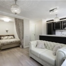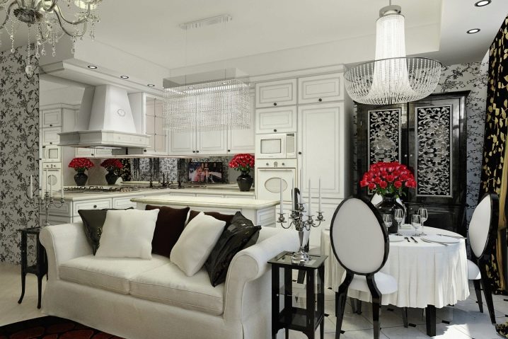 يمكنك تكبير المطبخ – غرفة معيشة في منطقة صغيرة بمساعدة الإضاءة والمرايا. حل التصميم هذا مثالي لمطبخ صغير بمساحة 7 إلى 13 مترًا مربعًا. م سيساعد استخدام الطلاءات المرآة والثريات الكريستالية في الداخل على إضافة مساحة بصريًا.
