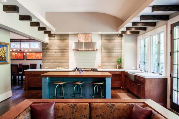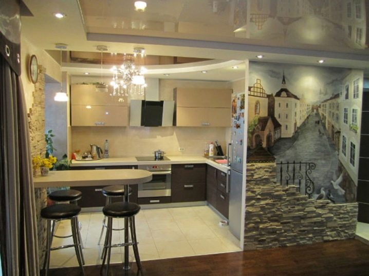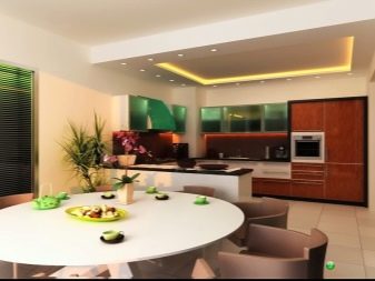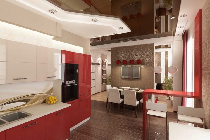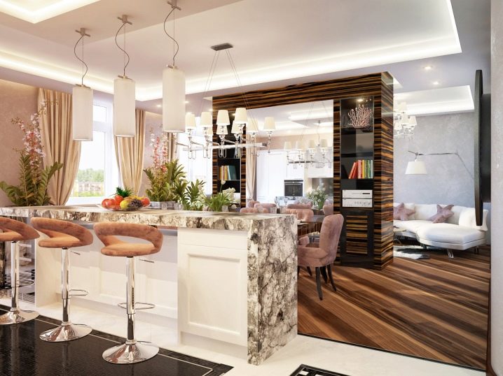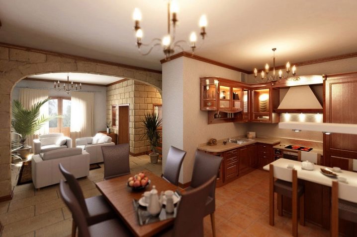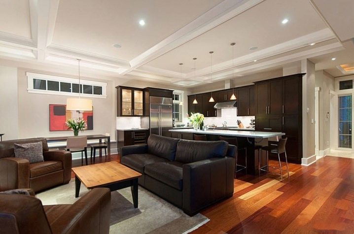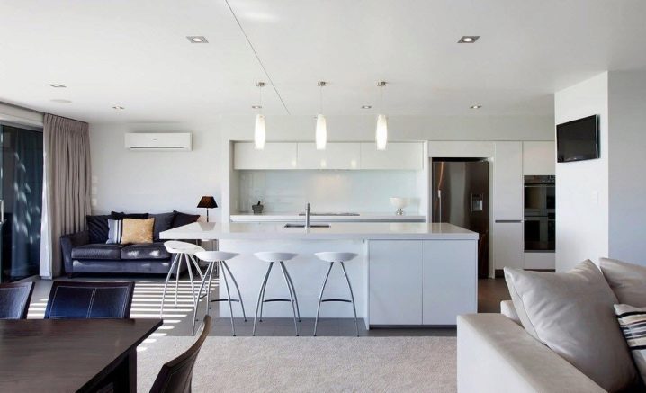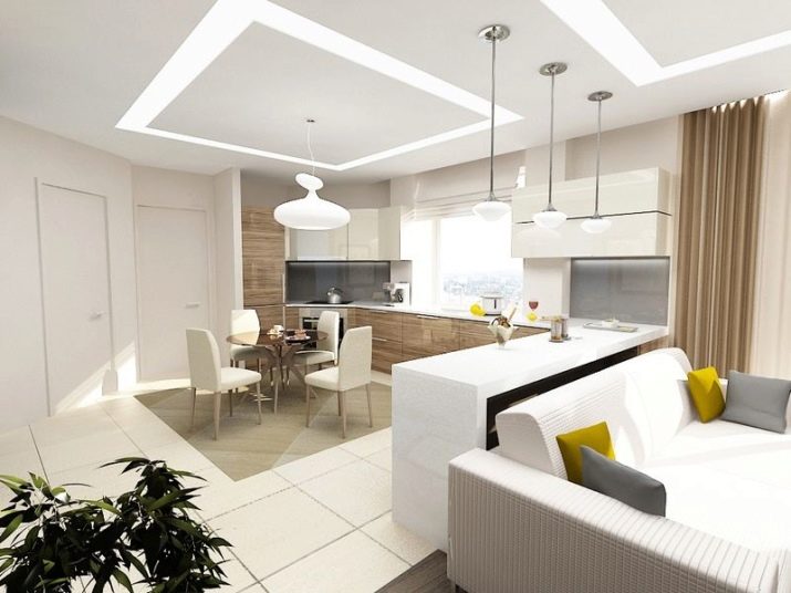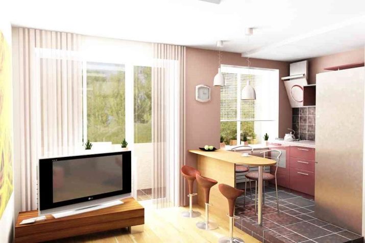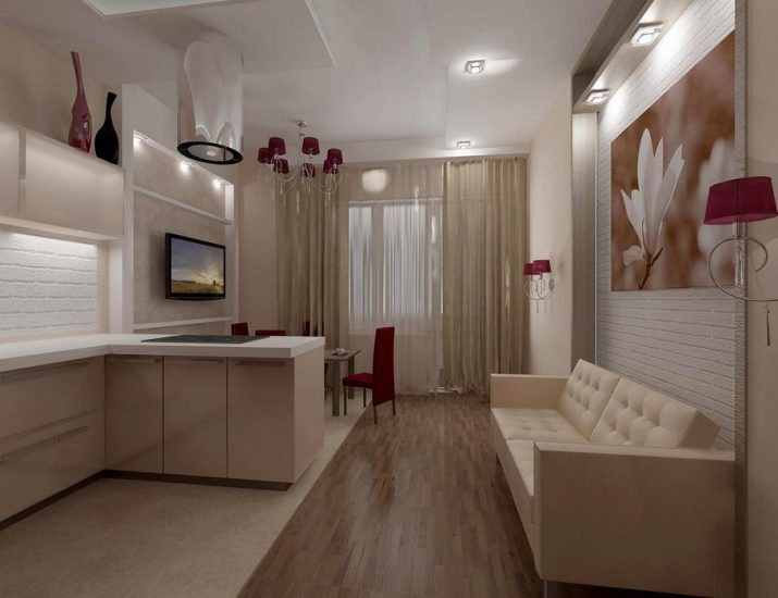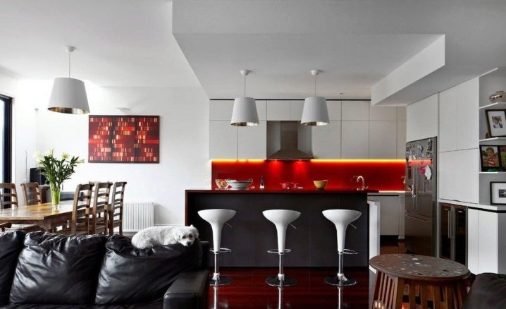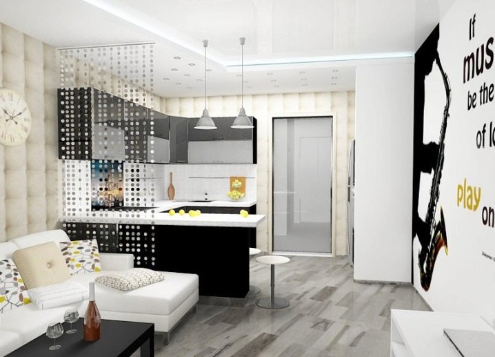 في الشقق الحديثة ، يتم الجمع بين المطبخ وغرفة المعيشة في كثير من الأحيان. عادة ما يستخدم هذا الحل في شقق الاستوديو ، لأن ليس لديهم مساحة كبيرة. من خلال الجمع بين غرفتين ، يمكنك توفير مساحة في الشقة.