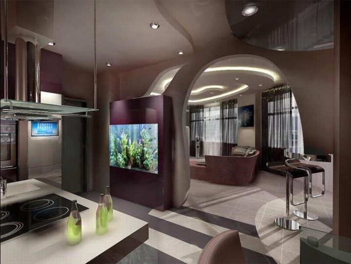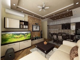 - حوض السمك أو النباتات. هذه الطريقة غير العادية ستضيف الأصالة إلى الغرفة. سيفصل حوض السمك الطويل بصريًا المطبخ عن غرفة المعيشة ويضيف تفردًا إلى الداخل. ولكن عند اتخاذ قرار بشأن هذا التقسيم ، عليك أن تأخذ في الاعتبار وجود الأطفال الصغار والحيوانات في المنزل..