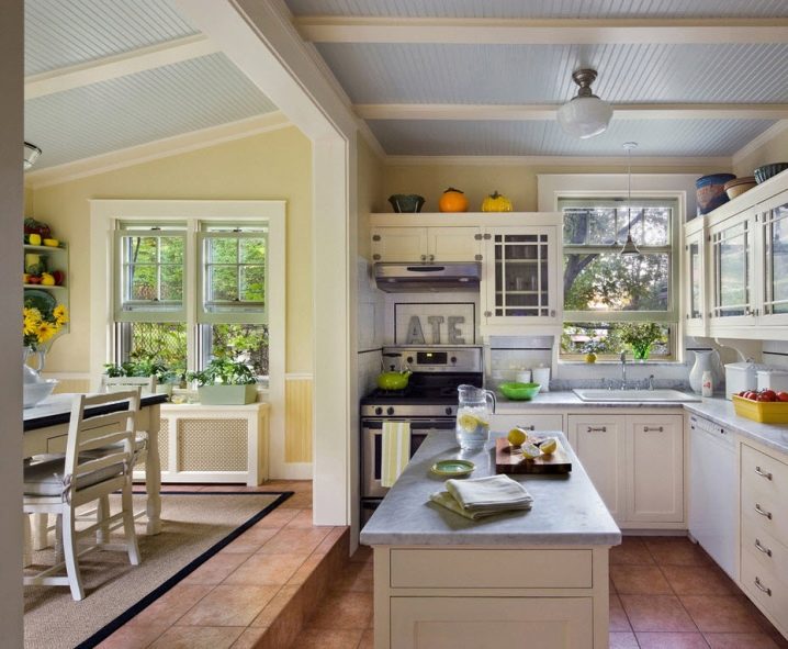 - عند تزيين السقف والأرضية ، من الضروري اختيار أي منهما سيوحد الغرف. على سبيل المثال ، إذا كان السقف من نفس اللون ، فيجب أن تكون أرضية المطبخ مختلفة عن الأرضية في غرفة المعيشة..