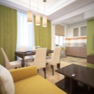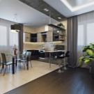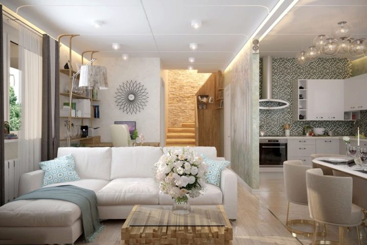 - إذا كان المطبخ – تبلغ مساحة غرفة المعيشة 40 إلى 70 مترًا مربعًا. م ، ثم يمكنك اختيار تصميم بنفس الأسلوب: