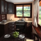 من خلال طلب أثاث الزاوية ، يمكنك توفير مساحة وإضافة إضاءة إلى المطبخ المشترك مع غرفة المعيشة. يجب تثبيت الحوض في الزاوية ، والثلاجة والموقد على جانبيها. يجب شراء الأجهزة المنزلية مدمجة ويفضل أن تكون مدمجة. يمكن أن يحتوي الموقد على شعلتين بدلاً من أربعة. فرن الميكروويف يمكن أن يحل محل الفرن.