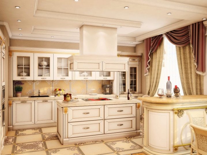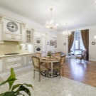- كلاسيك. إنشاء تصميم مطبخ – غرفة معيشة بأسلوب كلاسيكي ، يستخدمون أشكالًا رشيقة وألوان الباستيل الناعمة. لتزيين الجدران ، يتم استخدام الجص وورق الحائط والأقمشة ذات الألوان الفاتحة. يجب أن تكون الأرضية مغطاة بالبلاط الرخامي أو الباركيه أو الحجر. يجب أن يكون الأثاث خشبيًا بزخارف مذهبة. يمكنك استكمال الغرفة بالأعمدة.