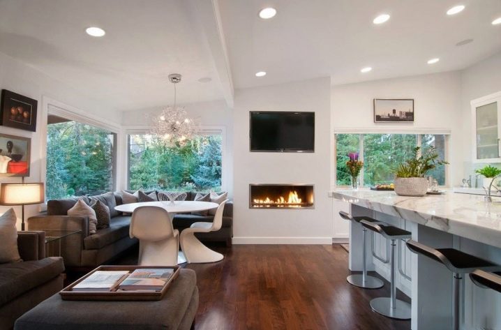 هذا العام من المألوف تصميم مطبخ – غرفة معيشة بدون تشطيب. على نحو متزايد ، بدأ استخدام الموقد في منزل حديث ، والذي لا يعمل فقط على تسخين المساحة ، ولكن يمكن أيضًا أن يكون بمثابة فاصل شرطي لمنطقتين..