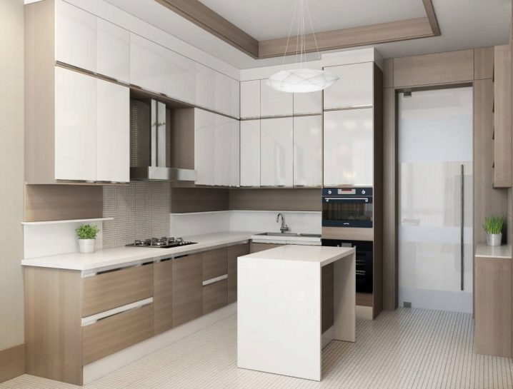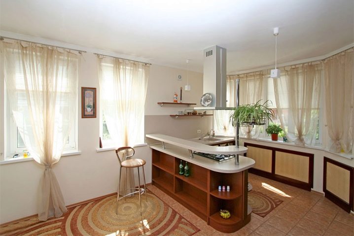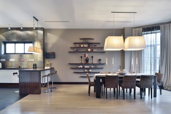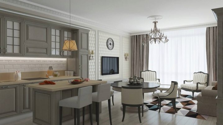 إذا كنت ترغب في الجمع بين المطبخ وغرفة الطعام ، ولكن في نفس الوقت قم بتحديدها في مناطق ، يمكنك وضع قسم على شكل طاولة بار أو مدفأة جزيرة.