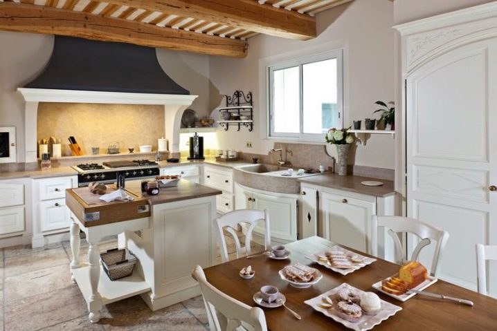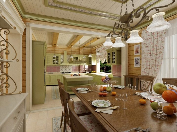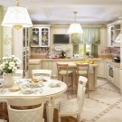 إنهم يزينون غرفة تناول الطعام في المطبخ بأسلوب بروفانس بالورود ، واللافندر يحظى بشعبية خاصة ؛ يمكنك وضع مفرش طاولة من الكتان على الطاولة ، وتعليق الستائر الخفيفة على النوافذ. سوف تتناسب ساعة الحائط القديمة بشكل جيد وعضووي مع مثل هذا التصميم الداخلي..