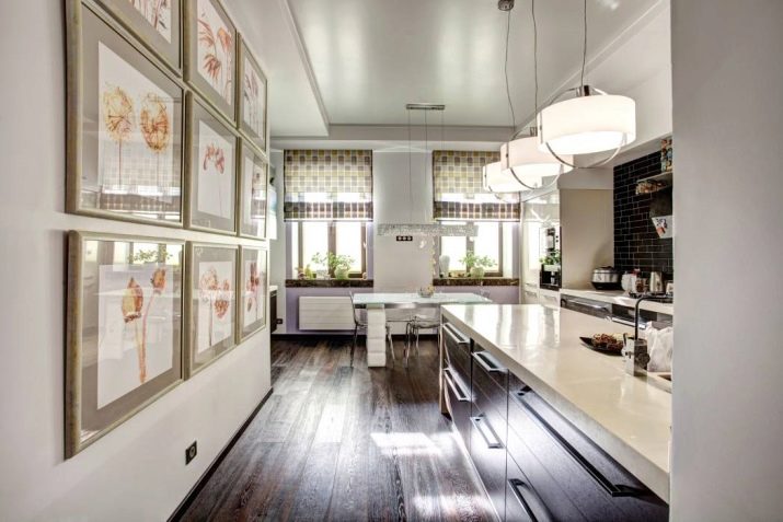 - التخطيط المتوازي. هذا الخيار ، على العكس من ذلك ، هو أكثر ملاءمة للغرف الفسيحة. ميزته هي وضع المطبخ بالتوازي في صفين ، ويتم تثبيت منطقة لتناول الطعام بينهما. من الممكن أيضًا عند تثبيت جزء الجدول في الزاوية ، ويتم تثبيت “جزيرة” عمل إضافية في المنتصف..