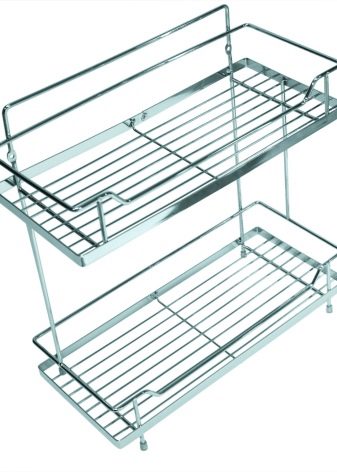 - أرفف معدنية. الخيار الأكثر شيوعًا هو الأرفف المصنوعة من نفس مادة العارضة. يمكن طلاء أرفف شبكة الفولاذ المقاوم للصدأ بالذهب أو العتيقة أو الكروم أو النيكل أو الحديد الزهر. ميزتها الرئيسية هي قوتها العالية ومقاومتها للتآكل والتآكل. ستشكل هذه الأرفف تركيبة متناغمة مع الدرابزين المثبت..