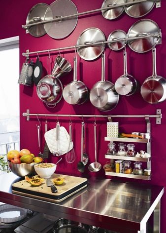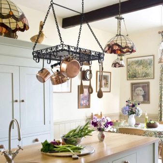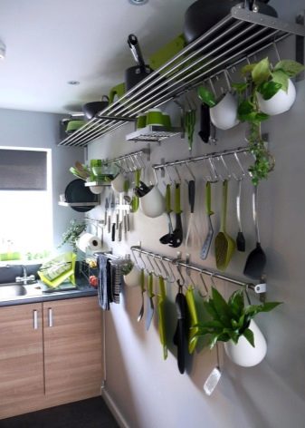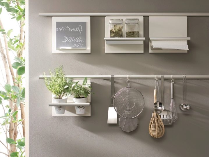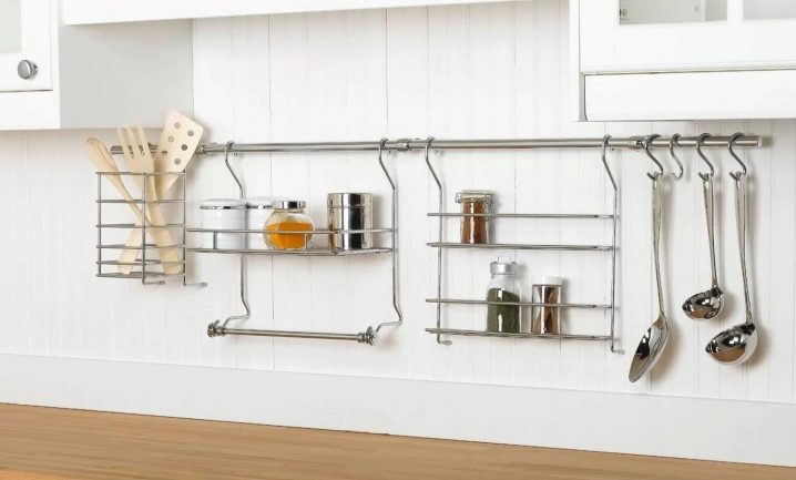 أول جهاز يتبادر إلى الذهن لوضع الأشياء على الدرابزين هو الخطافات. في الواقع ، توجد خطافات في أي نظام حديدي. من الملائم وضع حاملات الأواني والكاشطات والمغارف ومقصات المطبخ والأشياء بمقبض يمكن تعليقه من خطاف عليها. لكن في بعض الأحيان ، يؤدي تركيب أرفف الدرابزين إلى تبسيط مهمة وضع أدوات المطبخ..