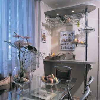 - أرفف زجاجية. إنها مصممة بشكل أساسي لتخزين الأكواب والأكواب والأواني الأخرى على سكك عمودية. في هذه الحالة ، تكون قاعدة الرف زجاجية متينة بشكل خاص ، تكملها عناصر معدنية تزين الرف وتزيد من قوته. يمكن أن تعمل الأرفف الزجاجية على شكل وعاء كصواني فواكه على رف حديدي عمودي.
