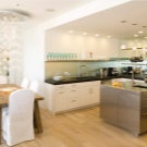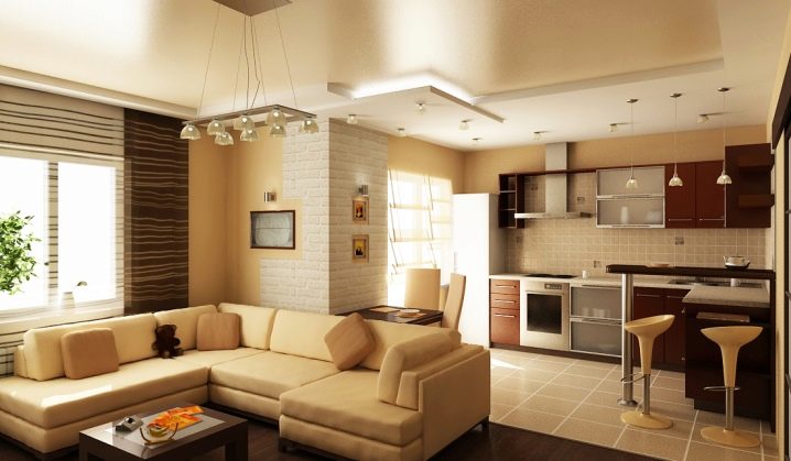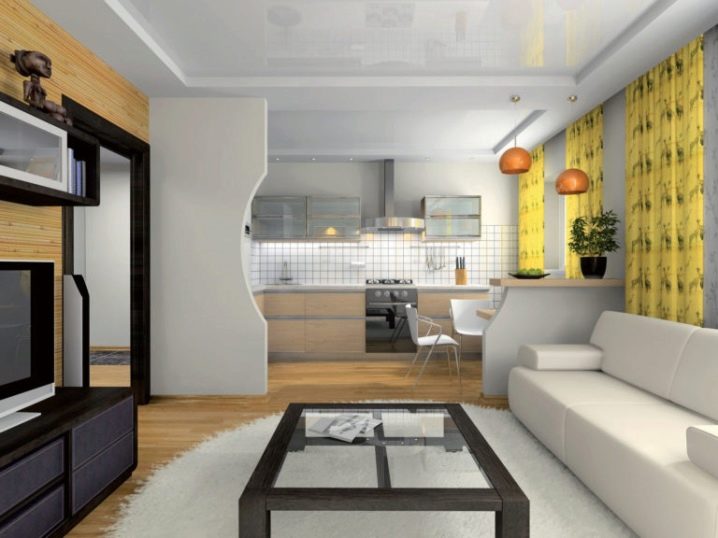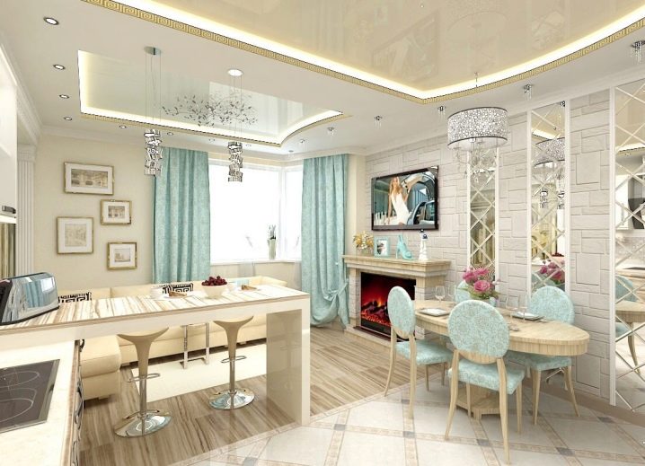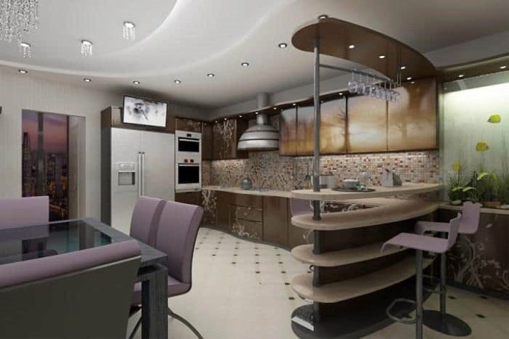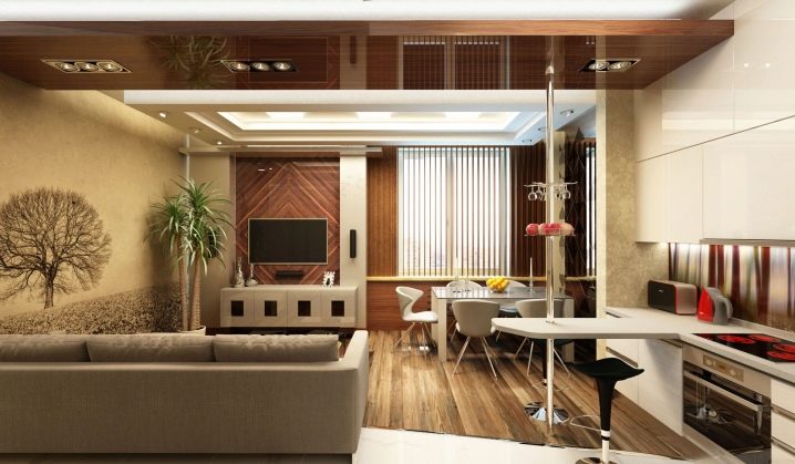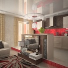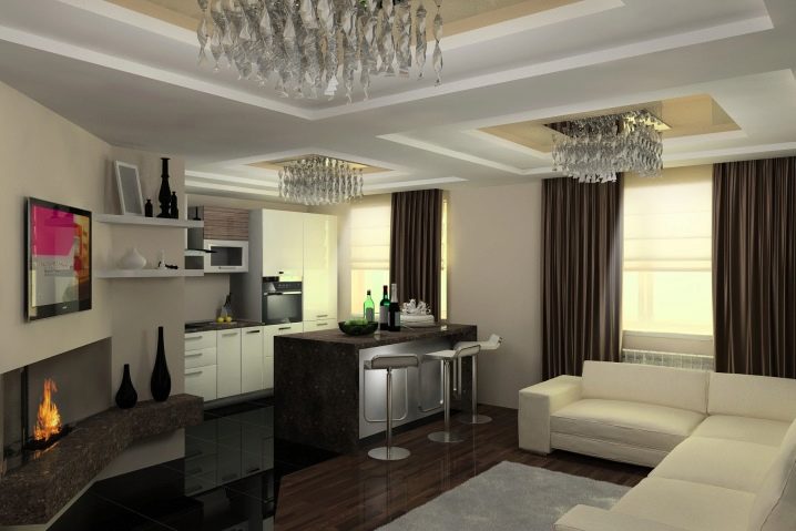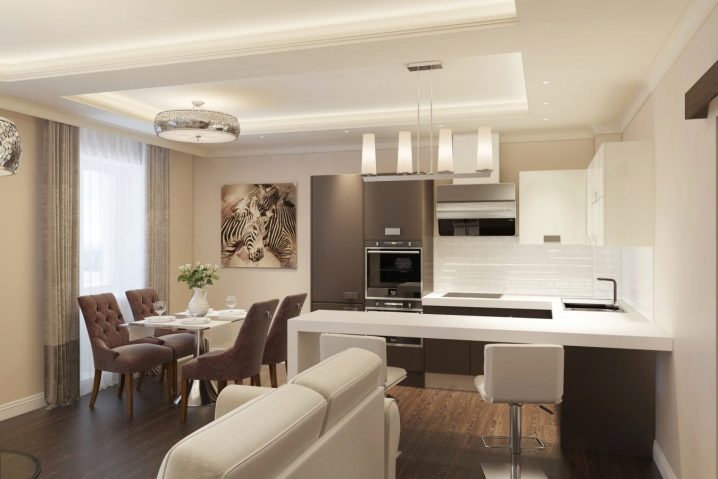 أصبح الجمع بين غرفة المعيشة ومنطقة المطبخ مؤخرًا اتجاهًا عصريًا. بعد إعادة التطوير ، يمكنك إنشاء تصميم مطبخ أصلي. في غرفة واحدة ، يمكنك الجمع بين كل من مكان الطهي ومنطقة الاستجمام. يمكنك التعامل مع هذه المهمة بأثاث عصري أنيق ، مثل طاولة البار..